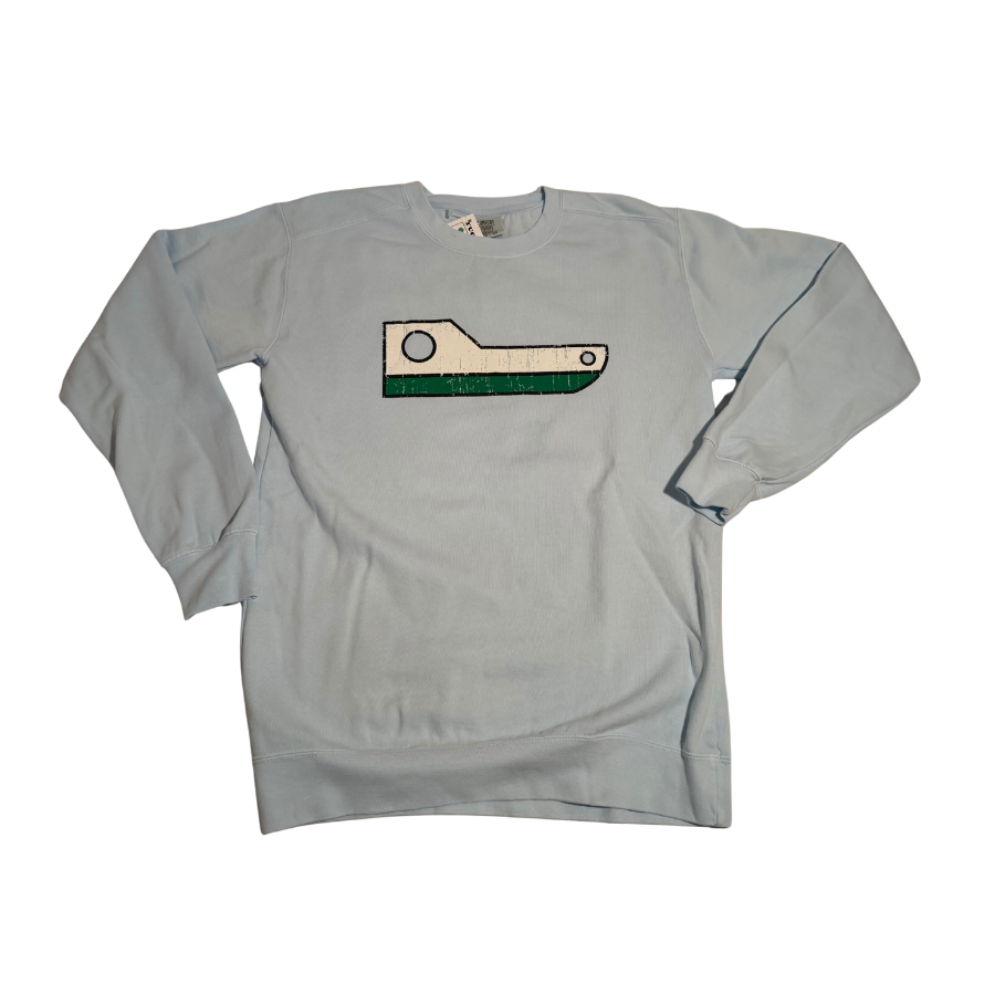 This soft and roomy crewneck sweatshirt is soon to be a wardrobe staple. It sports a distressed green and white tug on the front for a convenient reminder of one of your happy places – Fishtown – channeling daydreams of Cove cocktails, Cheese Shop sandwiches, and the smell of Carlson’s smoked fish.